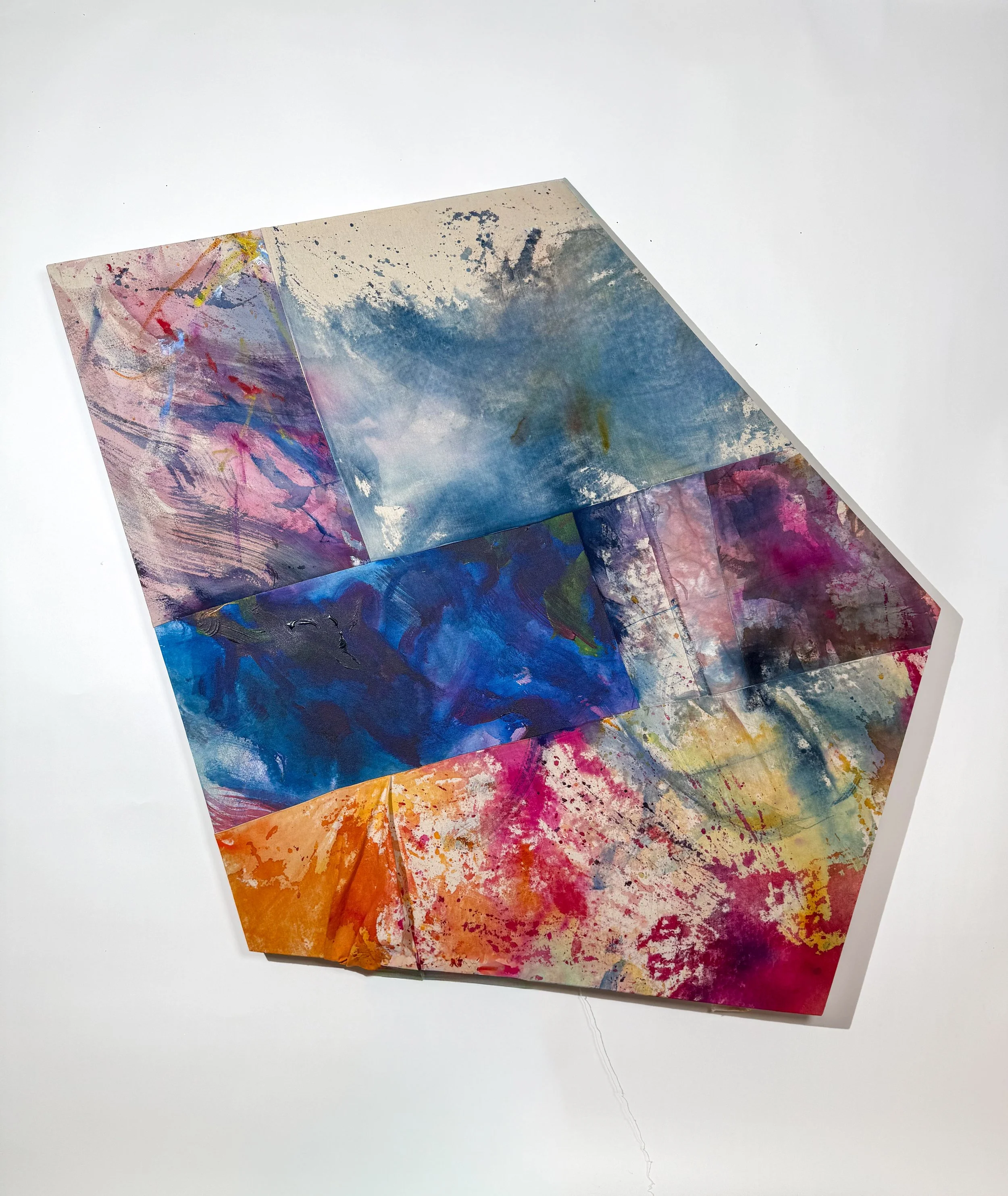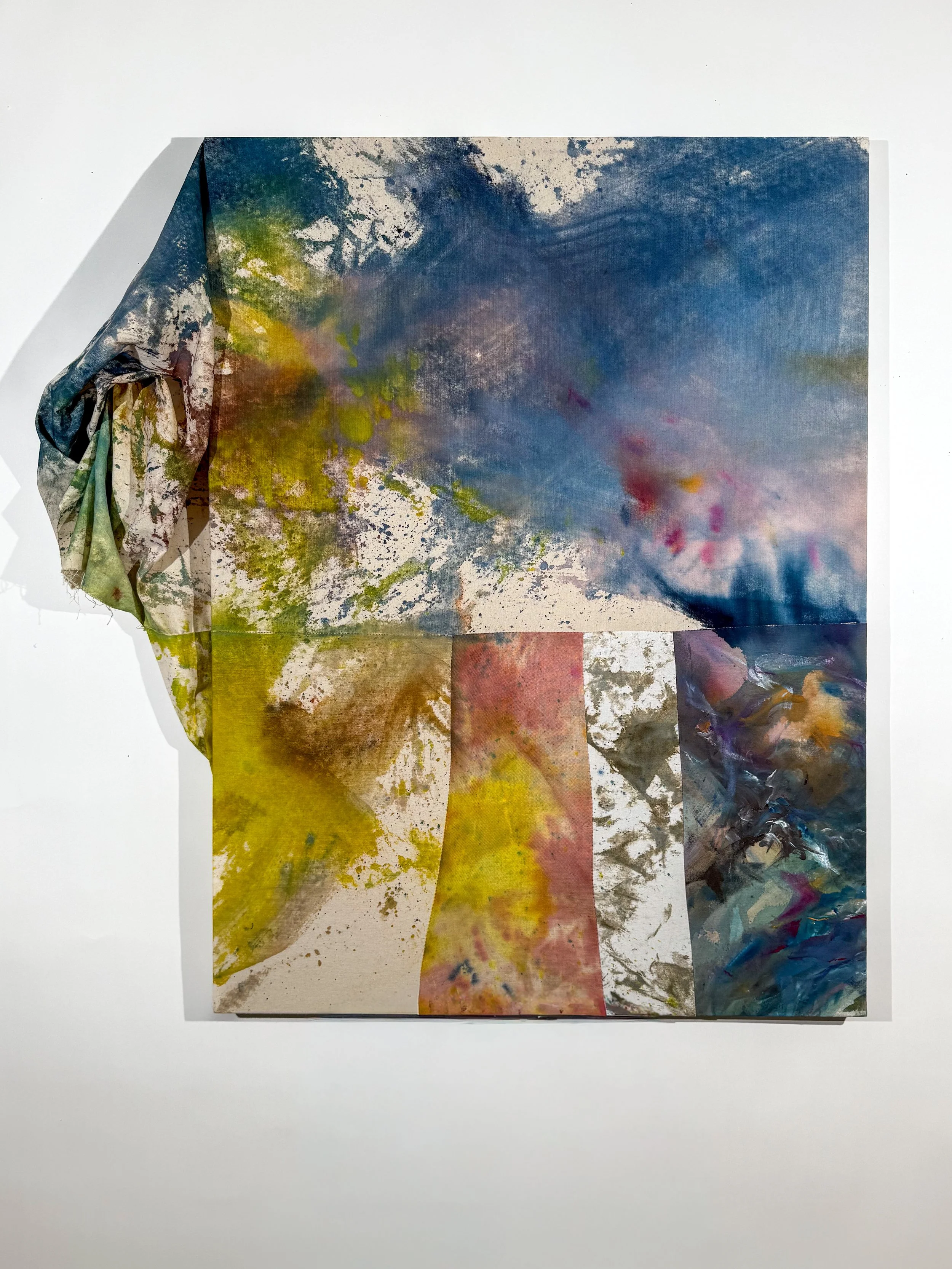 fiber reactive dye and acrylic on canvas, linen, and denim